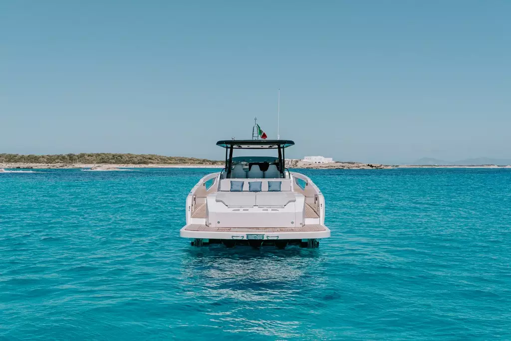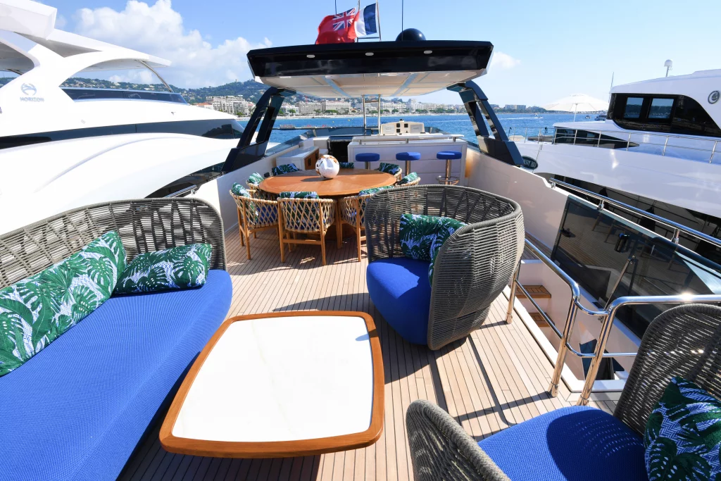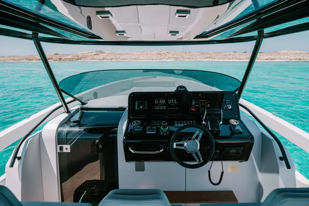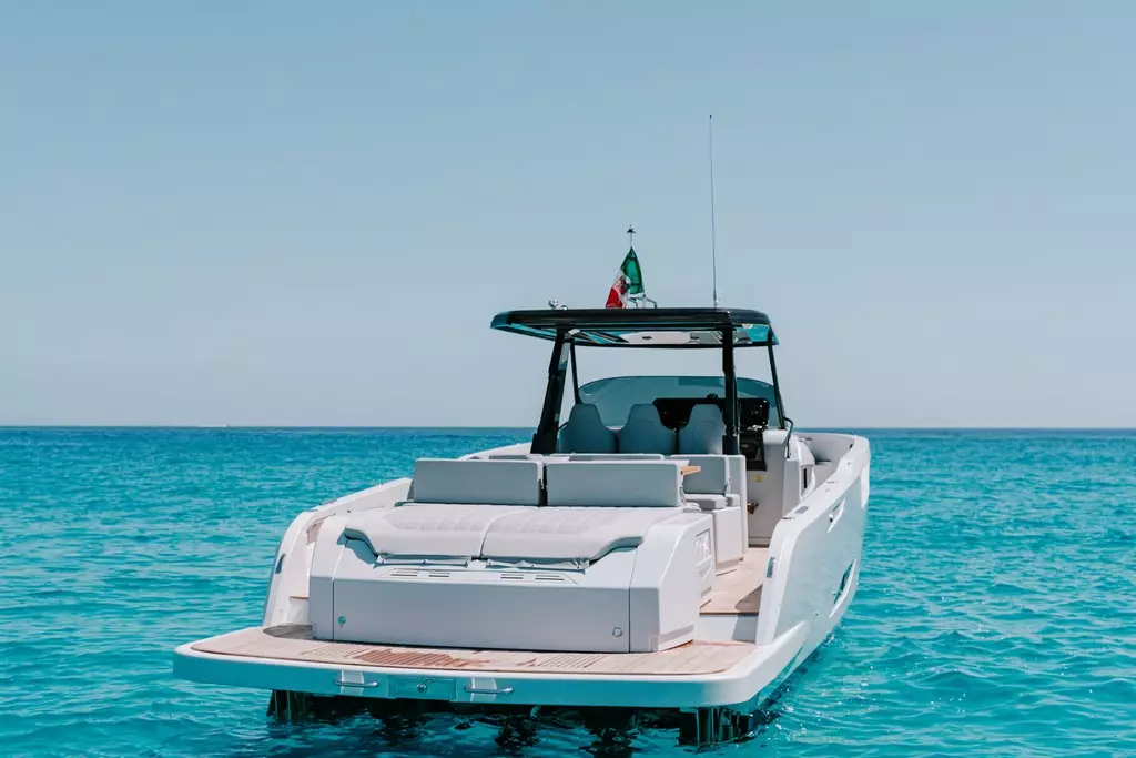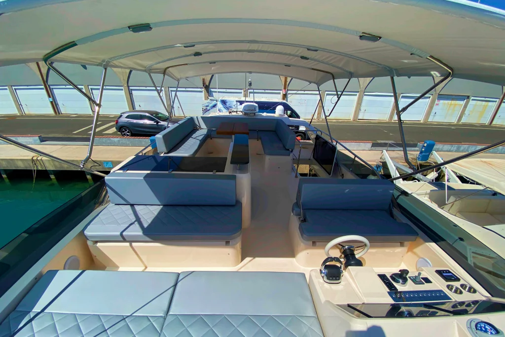 Discover this spectacular yacht that stands out for its sporty design and cutting-edge technology. The shade on the flybridge is complete thanks to its large bimini, perfect for enjoying the sun in peace. The hydraulic platform allows for easy access to the water and the interior is designed to provide luxury level comfort.