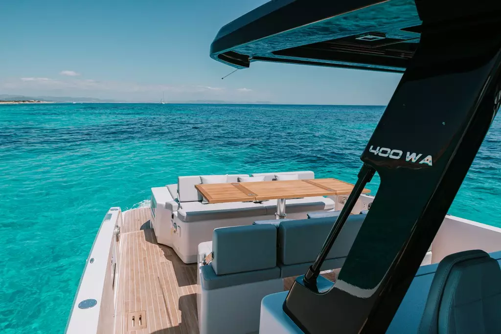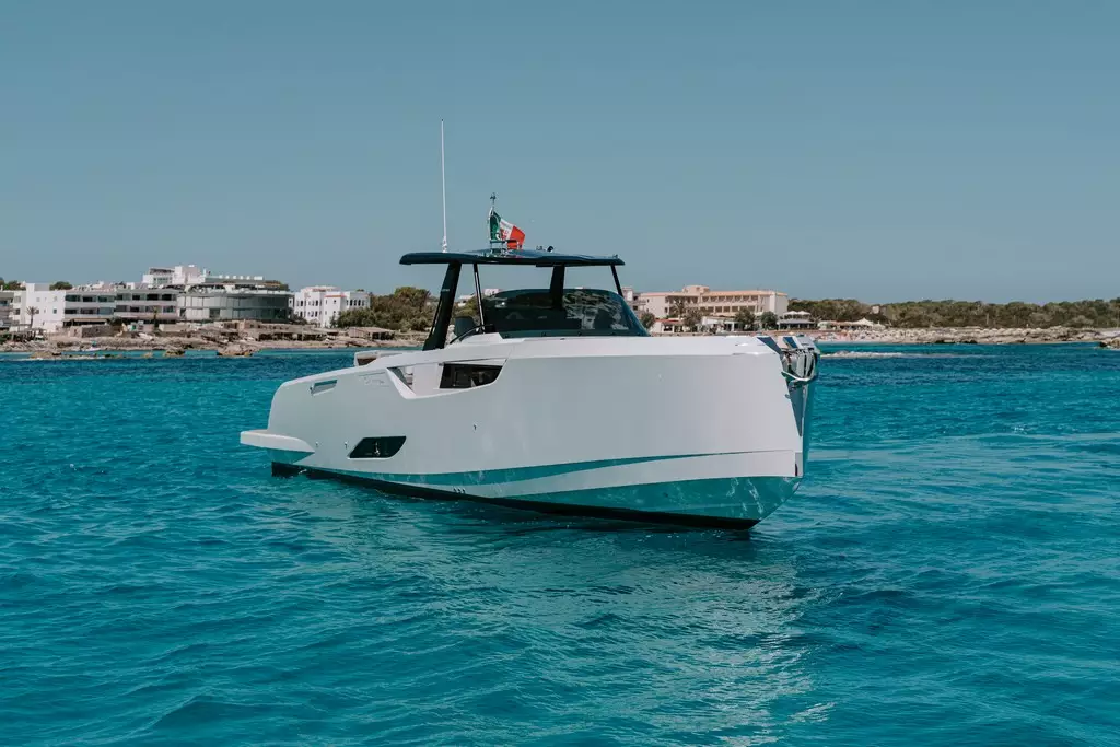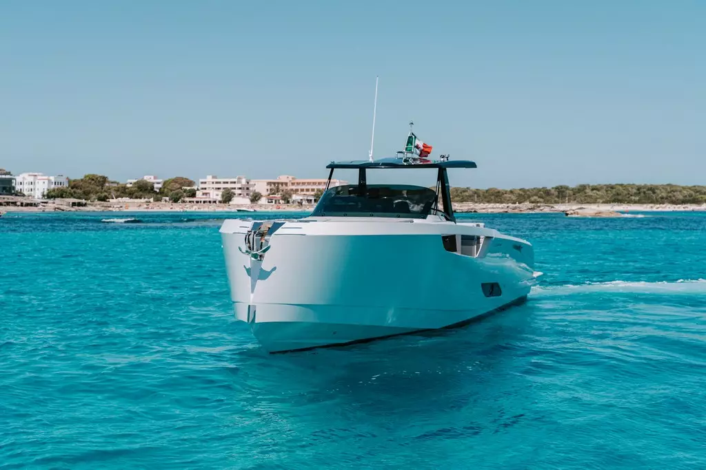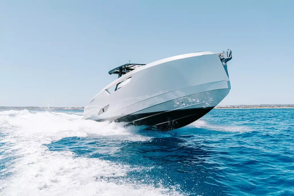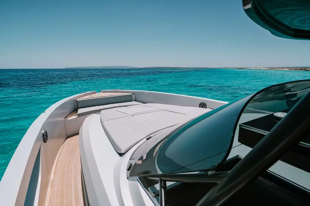Discover this spectacular yacht that stands out for its sporty design and cutting-edge technology. The shade on the flybridge is complete thanks to its large bimini, perfect for enjoying the sun in peace. The hydraulic platform allows for easy access to the water and the interior is designed to provide luxury level comfort.