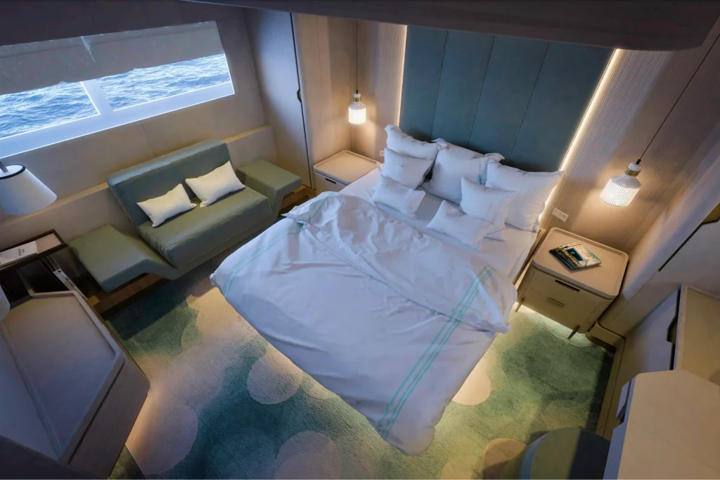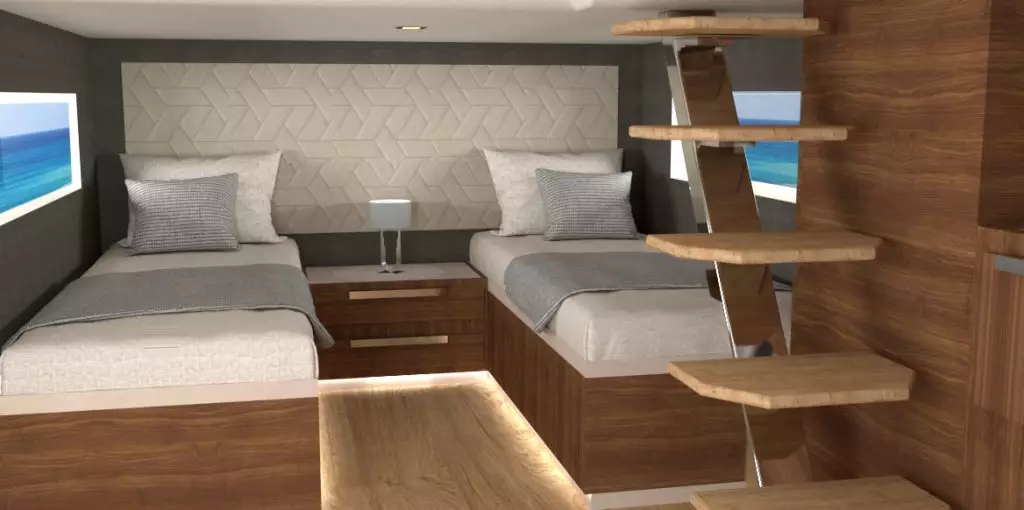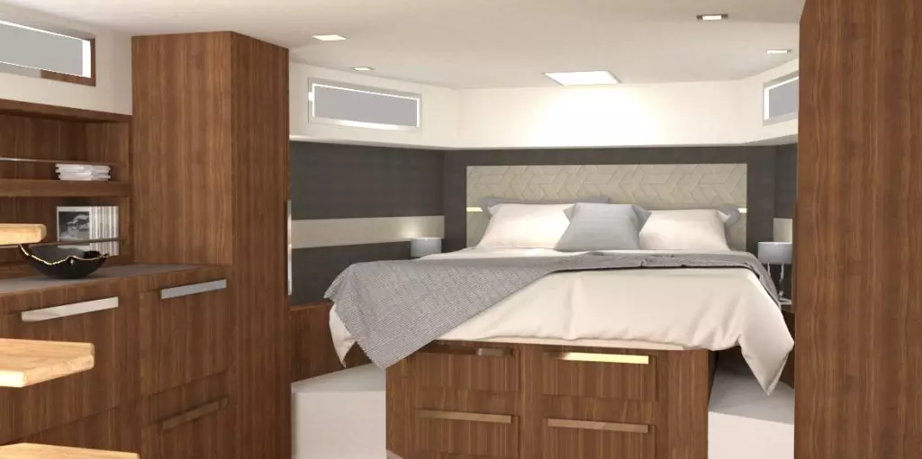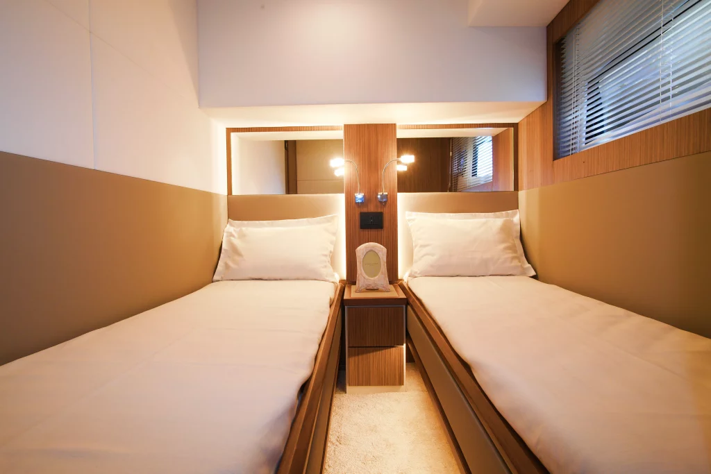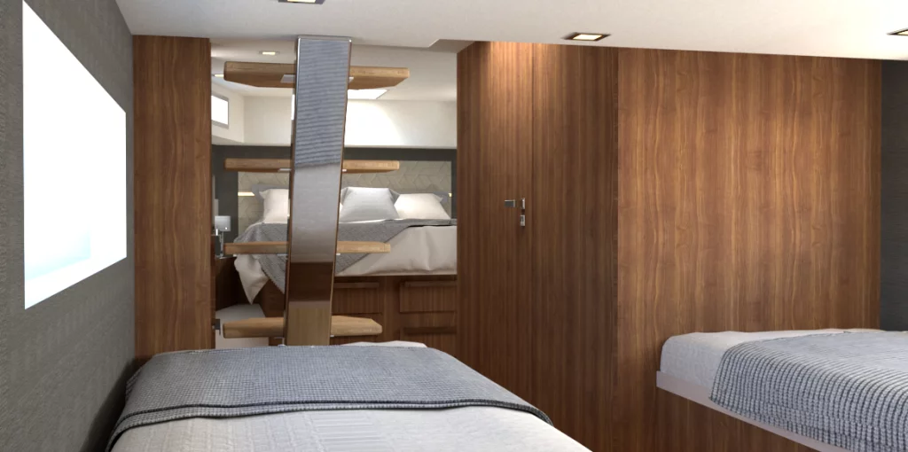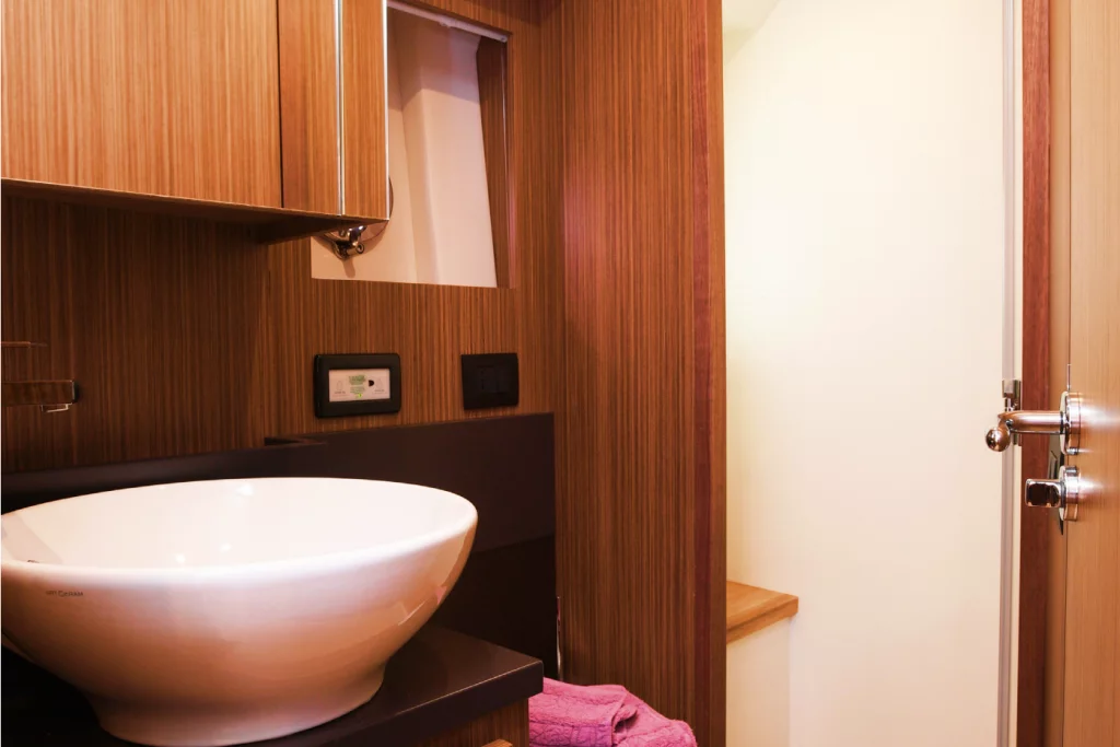 The large number of windows provide almost panoramic views from the salon, while the wide passageways provide great comfort onboard. The cabins are spacious and bright, with a size suitable for the boat’s width.