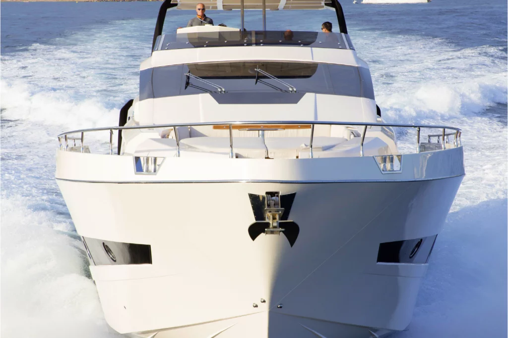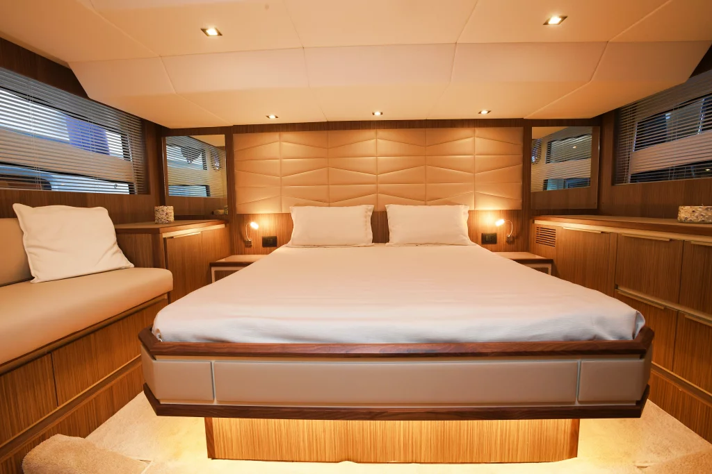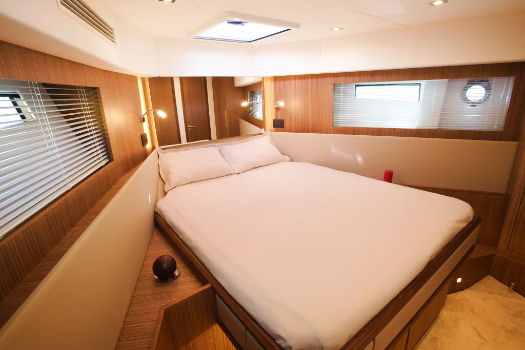 The expertly designed bimini provides a shaded area over the entire spacious flybridge. The two double cabins, spacious and inviting, make full use of the boat’s beam to offer unparalleled comfort.