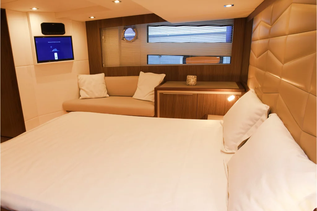 The expansive space on the bow of the yacht is perfect for lounging and soaking up the sun, with a comfortable seating area and a sun cover to provide shade when needed. The flybridge features a commanding helm station with almost 360-degree visibility, giving you a complete view of the yacht and its surroundings.