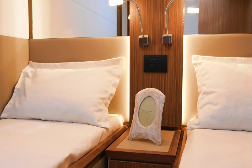 Below deck, featuring 2 cabins & 2 bathrooms, the design has utilised all available space in a super-efficient way, allowing you to relax as hard as you like.