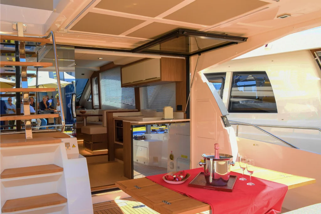 Because of the clever design and walk around features, the bow has seating for a large group and grand sunbathing bed space. Further back the dining space and fully equipped outdoor kitchen caters to all needs and with the huge sunbed covering the outboard engines (or IPS) there is plenty of room to relax.