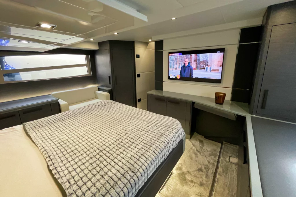 The yacht is powered by VOLVO IPS, making it easy to handle and maneuver thanks to the Joystick control. This advanced technology provides a smooth and efficient ride, whether you’re cruising at a leisurely pace or exploring new horizons.