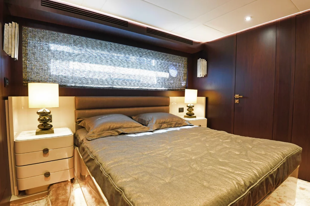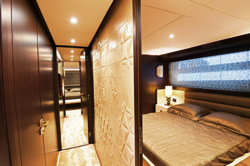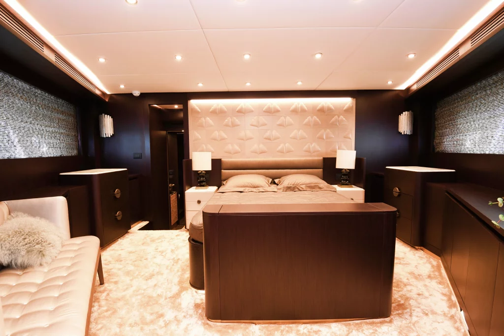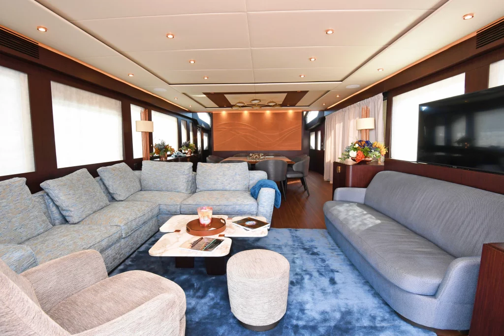 The interior of the yacht is designed with the Italian touch and features materials of the highest quality. The spacious salon is bright and airy, with an abundance of natural light streaming in through the many windows. The wide side decks make it easy to move around the exterior of the yacht, even during navigation, for added comfort.