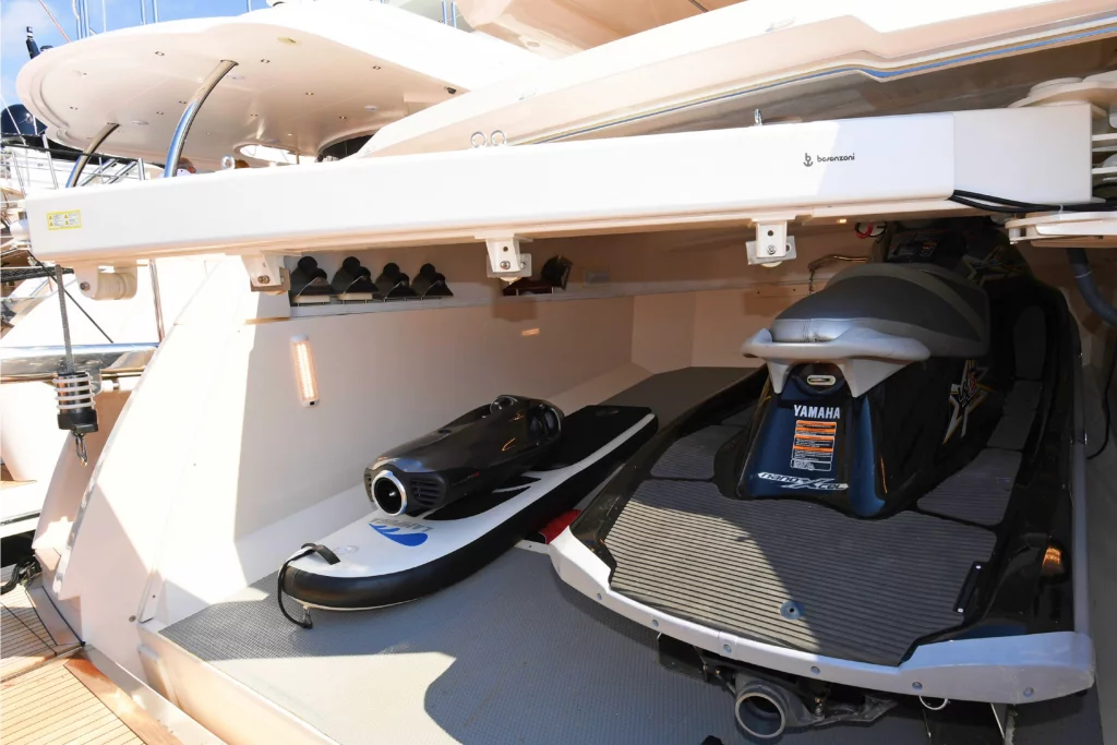 For water enthusiasts, the garage provides ample space to store a jet ski, two seabobs, and a paddle board. The engine room offers a well-appointed space between the engines, making maintenance a breeze.