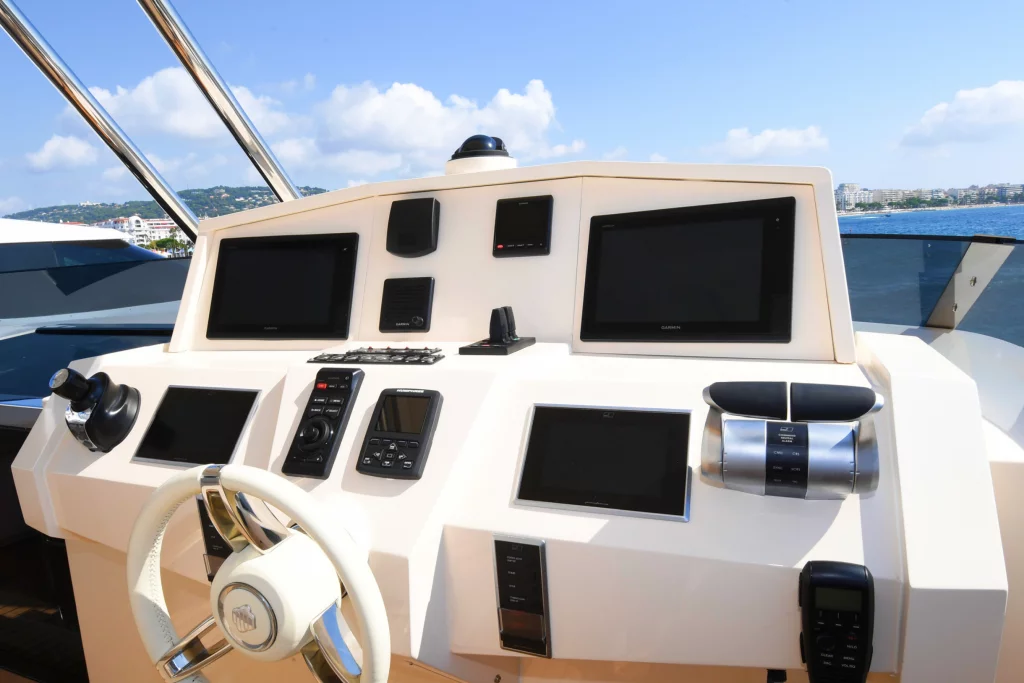 The elegant control bridge, optimally simplified, includes all necessary elements for smooth and safe navigation. This impressive vessel includes all kinds of cutting-edge technologies applicable to recreational boating, from the sophisticated VOLVO IPS Joystick propulsion system to state-of-the-art automatic control systems.